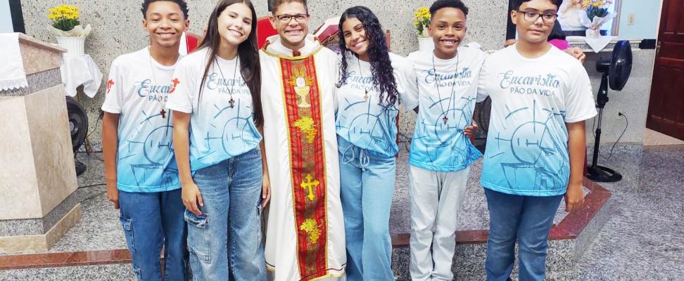 Padre Wilson conduziu o Rito das Promessas, seguido da Primeira Comunhão de cinco catequizandos.