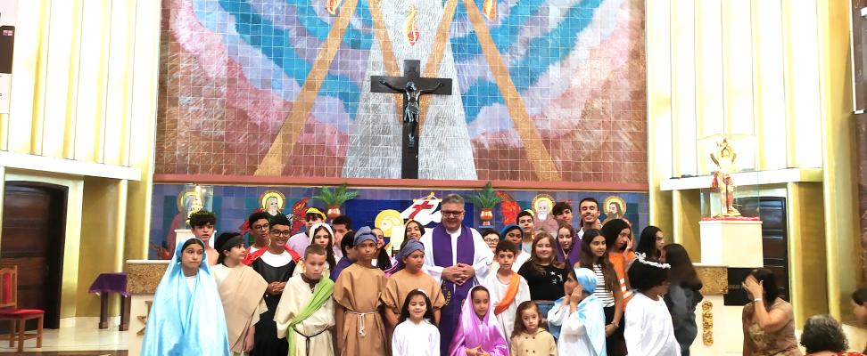 As crianças caracterizadas dramatizaram, a conduta exemplar de Maria, diante dos sofrimentos, das torturas que seu filho, Jesus sofreu pelos covardes. Maria manteve-se fiel, firme e forte, porque o Senhor estava presente ao seu lado, apesar das ignorâncias e ingratidões do povo.